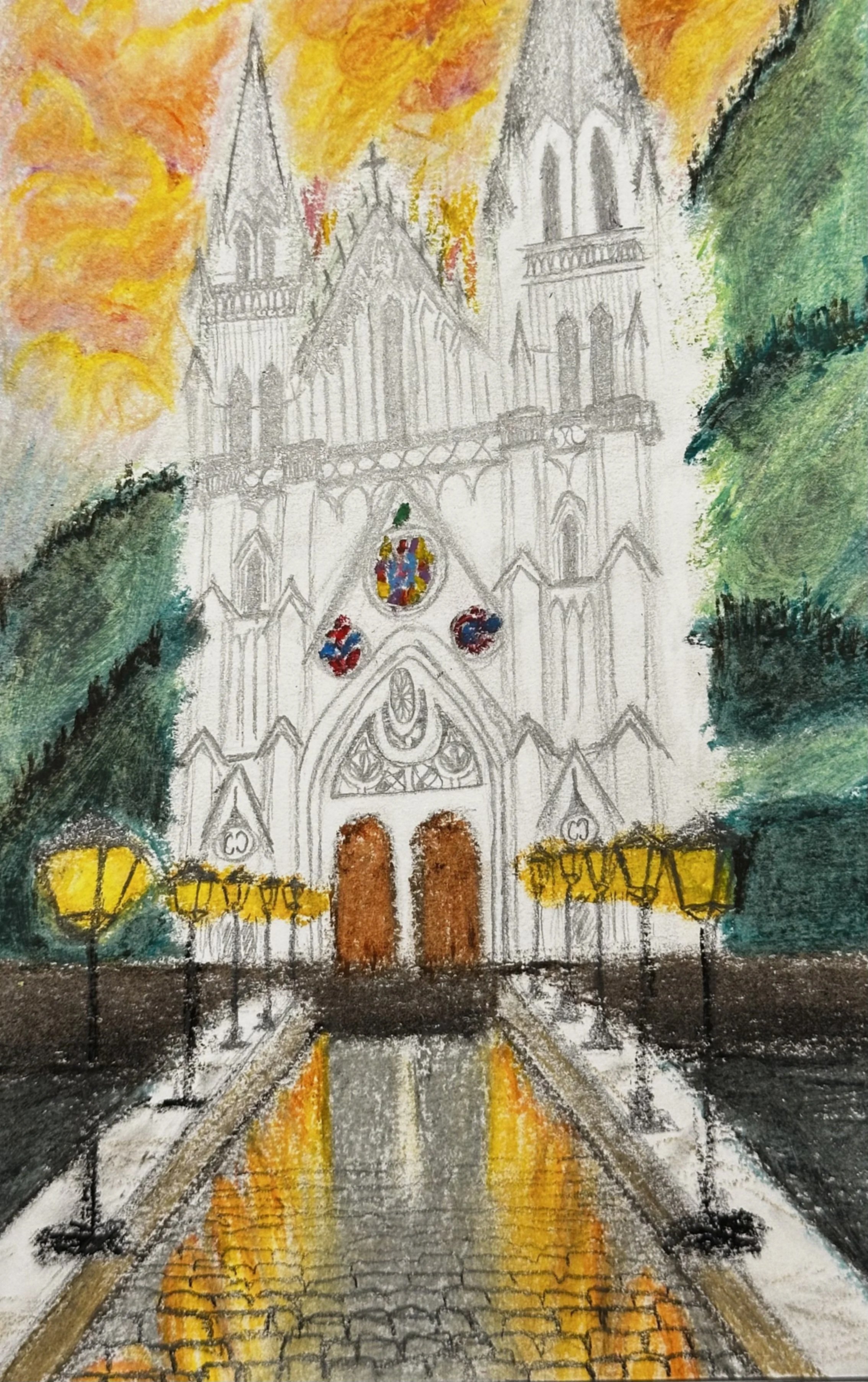 My first art piece of 2026: first time using oils + graphite pencils. Completed January 9, 2026. The removal of the colors from the gothic cathedral were intentional, as I view infinite consciousness as self-illuminating complete light which gets differentiated through prisms (creations/containers), resulting in a multiplicity of consciousness (rainbow of colors). The dreamy, bright colors everywhere indicate that the divine and infinite consciousness is not contained to just a cathedral, but rather, everywhere as god is everywhere in everything. Inspired by my passion for dark consciousness and its intersection of cosmology, a gothic cathedral was the perfect representation of the two. And who doesn’t love dark mountains and a psychedelic sky?